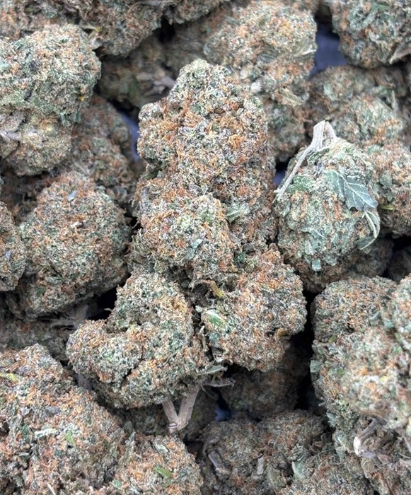 Flores densas, voluminosas y resinosas, con pistilos naranjas y un recubrimiento de tricomas visible. En buena curación, mantienen un aroma penetrante y un aspecto de flor premium.